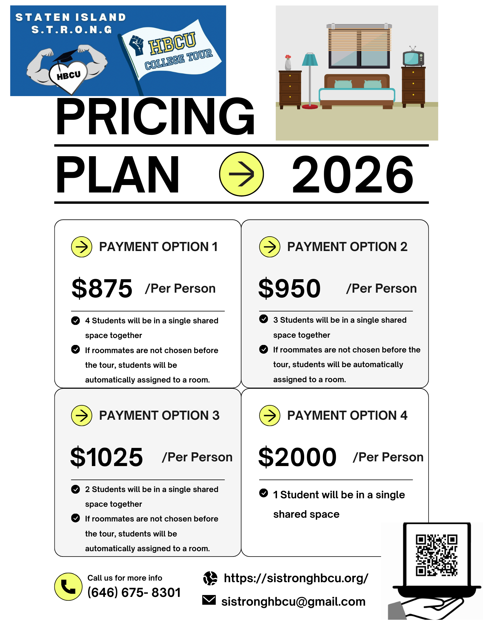 Secure your seat on the 2026 HBCU College Tour. 9 campuses, 6 days, fully supervised. Rooms accommodate 4 students — additional cost for fewer per room.