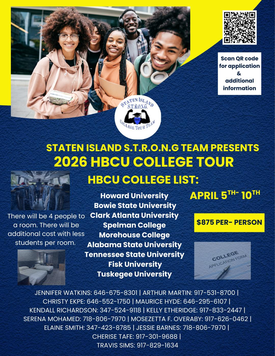 Transportation, hotel accommodations (4 per room), campus tours at all 9 HBCUs, and group activities. Additional cost applies for fewer students per room.